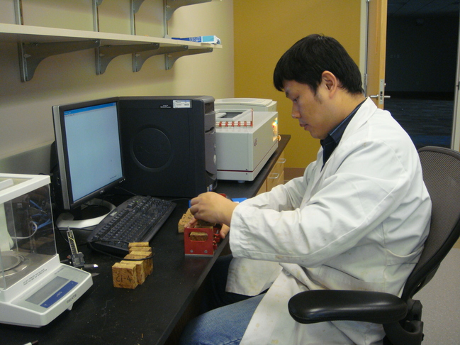 余雁的研究主要以木材、竹材为对象,揭示影响木竹材料性能的关键因子,开发相应的高值化利用技术,并致力于实现商业化应用。“木材、竹材制品一直是生活的必需品,具有很多优点,比如具有吸引人的外观、绿色环保、可持续等。但也有明显的缺点,比如耐候性不好,对光照、冷热、水分、细菌等造成的综合破坏耐受能力较差。”为了克服这些缺点,余雁带领团队长期聚焦木竹材功能化研究。“木竹材的功能化就是针对实体木材和竹材,用物理、化学的方法对这些材料进行功能改良,克服它的缺陷,拓宽其应用领域并延长使用寿命,从而减少碳的排放。”余雁带领团队在国内最早开展了木竹材糠醇改性技术研究,研发成功具有自主知识产权的新型催化剂体系,完成了产业化中试。其研发的糠醇树脂改性技术让木竹材制品的生物耐久性和使用寿命获得了显著提升。此外,他领导的团队在国内最早开展了竹材表面无机纳米功能化的应用基础研究,使竹材在完保持天然色泽和纹理的同时,具有超疏水、强抗紫外及抗菌性等特性,开创了国内木竹材料表面纳米功能化研究的新领域。