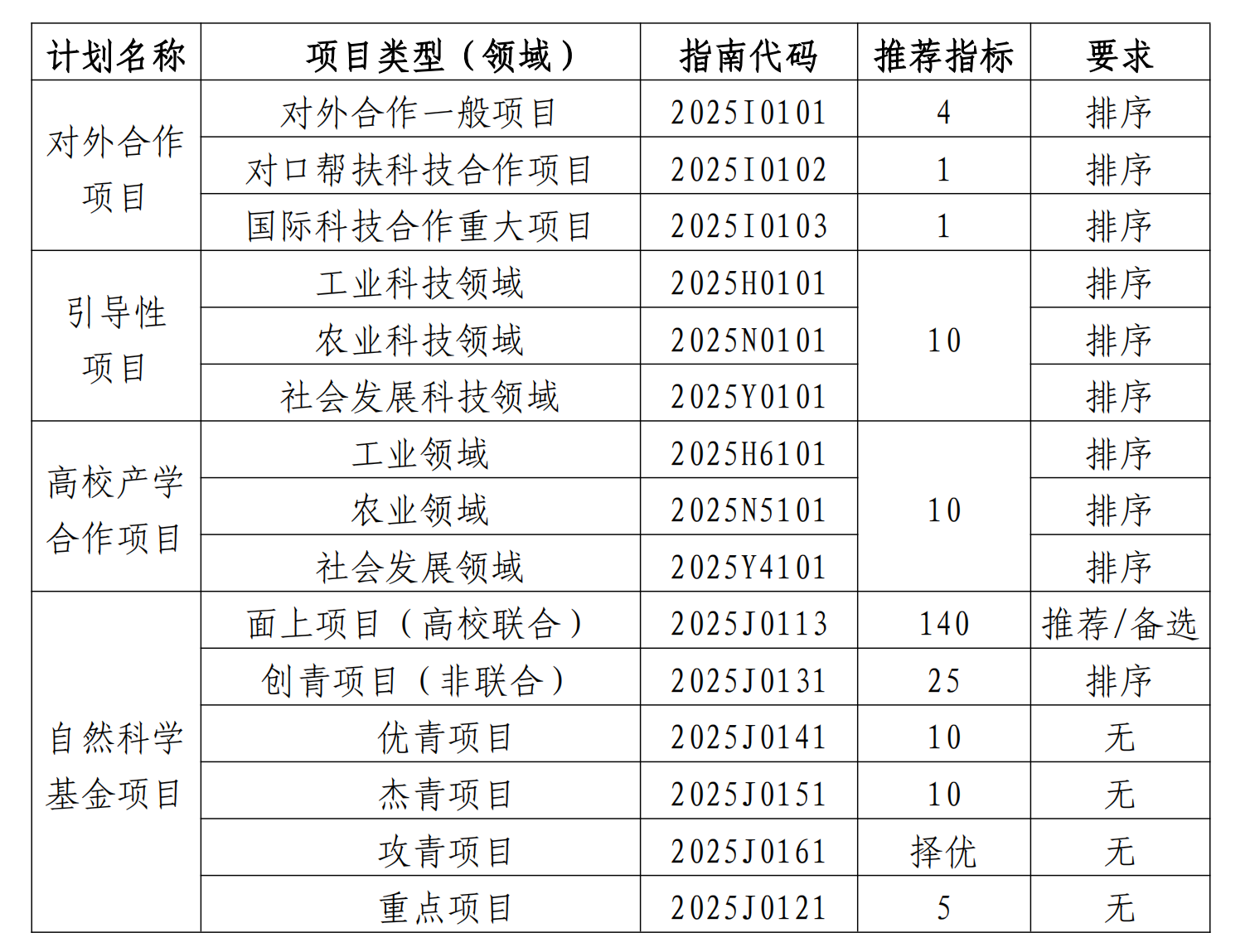 现转发《福建省科学技术厅关于组织申报2025年度省科技计划项目的通知》(闽科资〔2025〕1号),请按照通知要求,组织科研人员进行项目申报。各类项目申报指南详见福建省科学技术厅网站-通知公告https://kjt.fujian.gov.cn/xxgk/tzgg/202501/t20250110_6698992.htm)。现将有关注意事项通知如下: