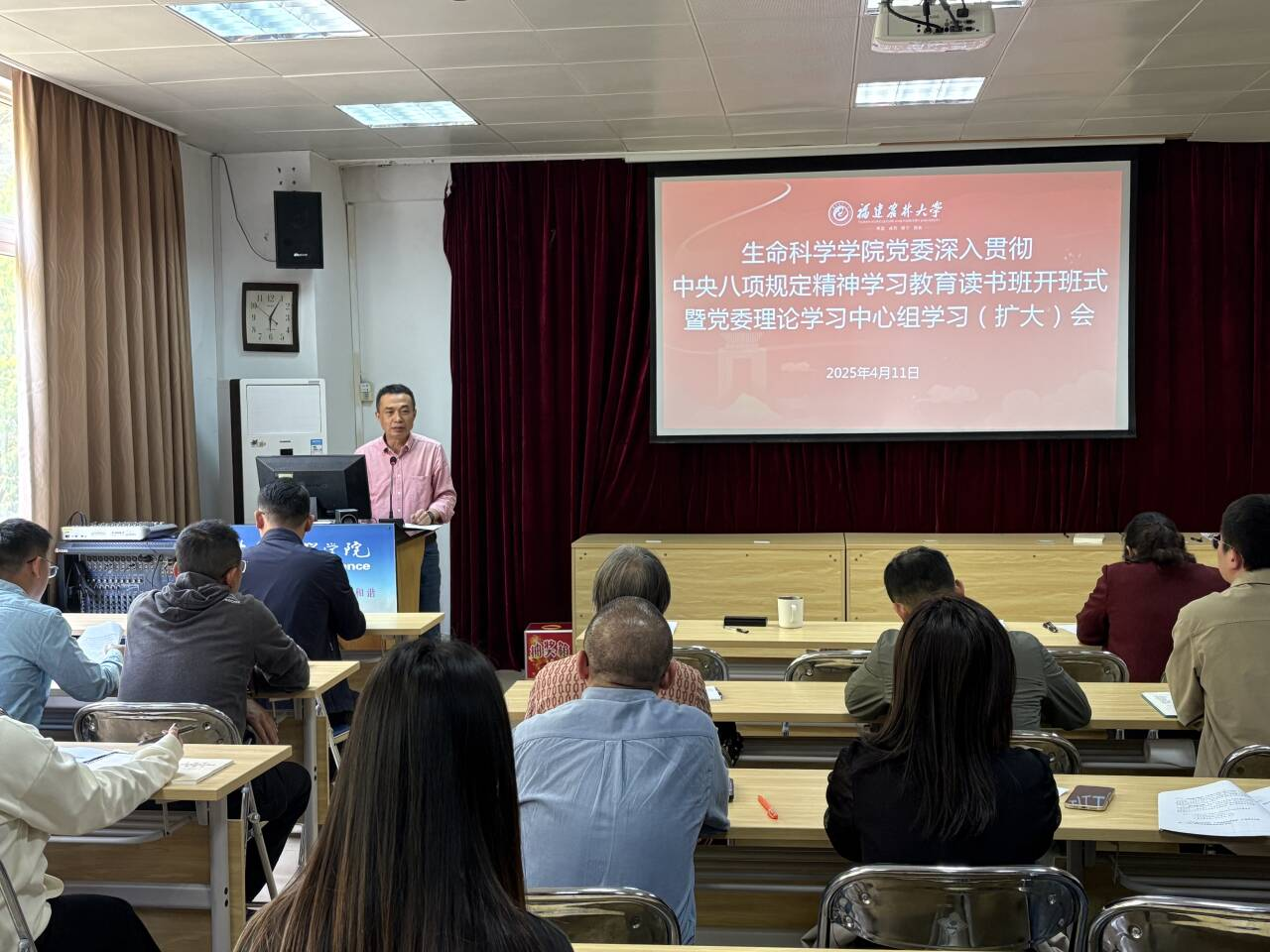 4月11日上午,生命科学学院党委深入贯彻中央八项规定精神学习教育读书班开班式暨党委理论学习中心组学习(扩大)会在生科楼414举行。会议由院党委书记余顺兴主持,院领导班子成员、中心组成员、各党支部书记等参加会议。