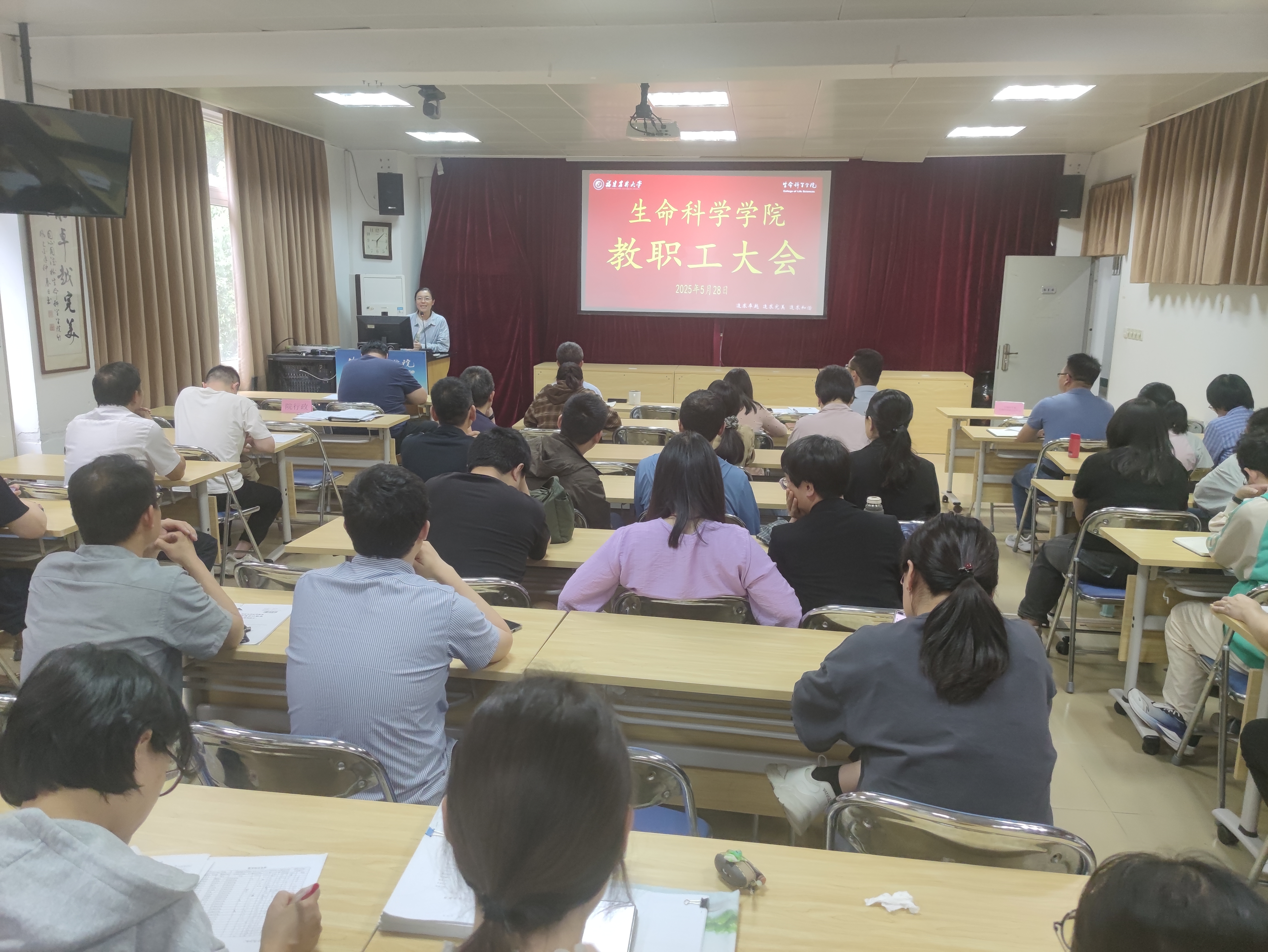 5月28日下午,生命科学学院在生科楼414召开全院教职工大会,学院全体教职工参加,会议由院党委书记余顺兴主持。