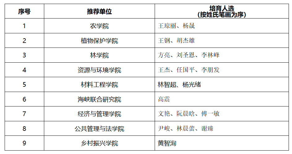 根据《williamhill英国官网新时代高层次人才“双百计划”实施方案(试行)》(闽农林大人〔2023〕3号)精神,经个人自由申报,学院审核把关,科技处、社会科学处形式审查,专家评审推荐,学校研究,产生2025年“百人攀登计划”培育人选20名,其中自然科学13人、社会科学7人。现将名单公示如下: