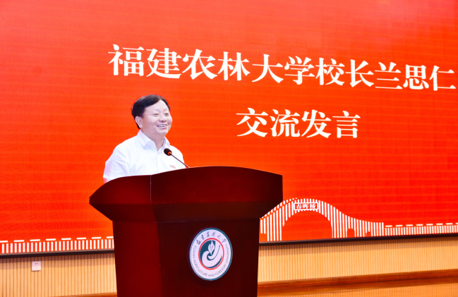 兰思仁作交流发言和总结讲话。他在发言中系统阐述了江一真同志在兼任福建农学院院长期间形成的一系列卓有远见且历久弥新的办学思想及其时代价值:一是坚持人才培养与生产实践相结合。倡导理论联系实际,扎根大地办教育的导向;二是坚持因地制宜推进教育教学改革。紧密结全中国和本土实际,设置发展学科。三是坚持依靠专家教授办学兴教。大力拓展知识分子发展渠道,尊重人才、爱惜人才。四是坚持教学与科研齐头并进。营造浓厚学术氛围,推动农业科学技术持续进步。