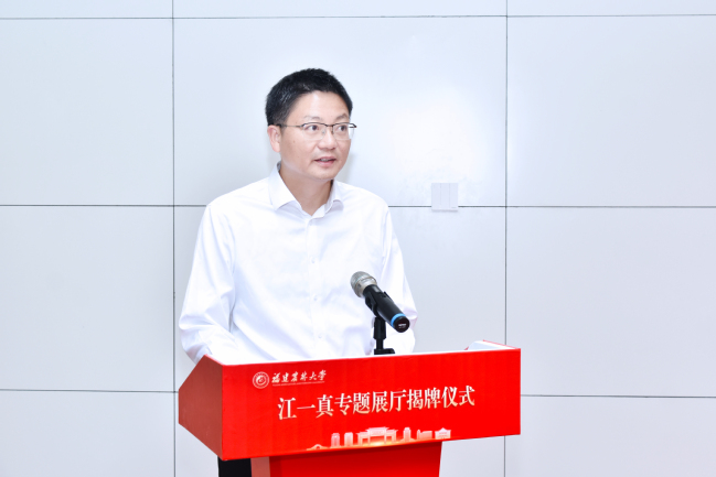 揭牌仪式上,赖海榕代表学校致辞,向莅临的领导嘉宾表示热烈欢迎,向远道而来的江一真老校长的亲属们致以崇高的敬意和诚挚感谢。他指出,江一真老校长是学校的奠基者和开拓者,为学校初创与发展倾注了心血,留下了弥足珍贵的办学思想和精神财富。今年是江一真老校长诞辰110周年,建设专题展厅既为寄托深切的缅怀与崇高的敬意,更要将江一真老校长坚定的信念、求真的勇气、为民的情怀与实干的作风,凝铸为薪火相传的精神火炬,成为照亮全校师生未来道路的灯火。他表示,学校将以此次揭牌为新的起点,用心守护好这片精神家园,持续完善展厅建设、丰富展陈叙事、提升观展体验,使之真正成为传承老校长精神、展现其不凡人生的温暖家园。将传承弘扬老校长的崇高风范,将其精神品格融入思政教育、师德师风和校园文化,引领师生见贤思齐、修身笃行、担当实干。将矢志践行老校长严谨求真的工作作风,锚定国家“双一流”目标,在学科建设上追求卓越,在人才培养上精益求精,在科研创新上勇攀高峰,在社会服务上担当作为,奋力谱写学校高质量发展的新篇章。