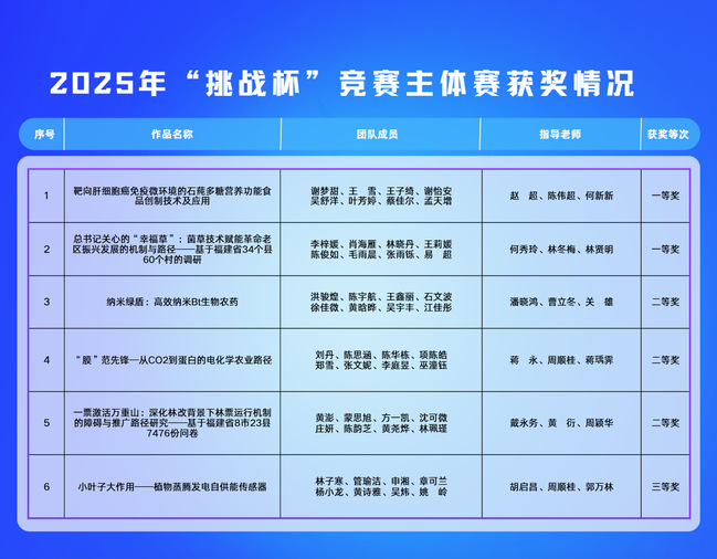 10月31日至11月3日,第十九届“挑战杯”全国大学生课外学术科技作品竞赛决赛、科创报国汇报会暨颁奖活动在南京大学举行。学校在主体赛、“揭榜挂帅”擂台赛、“人工智能+”专项赛共斩获国家奖25项,并以团体总分位列全国高校第36位的优异成绩捧得“优胜杯”,成为全国56所“优胜杯”高校中唯一一所农林类高校。学校高度重视“挑战杯”竞赛的育人价值,紧紧围绕立德树人根本任务和“双一流”建设目标,扎实推动科创育人工作,校党委书记赖海榕、校长兰思仁及相关校领导多次关心指导赛事组织工作,校党委副书记曾华平专程前往赛场,亲切看望并指导参赛师生。