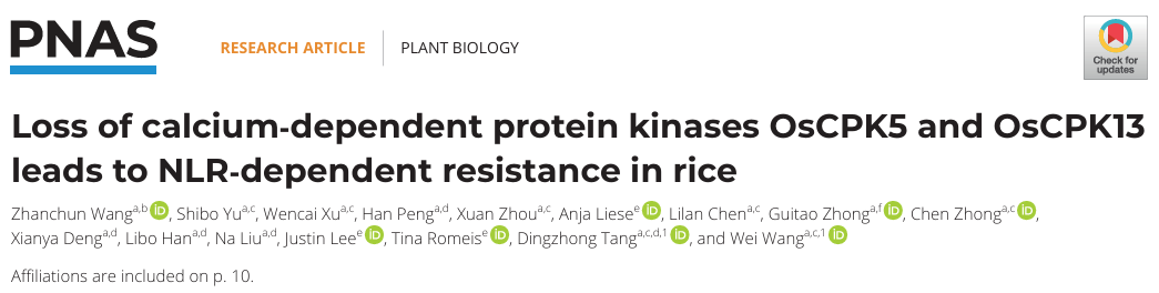 近日,williamhill英国官网唐定中教授团队在《美国科学院院刊》PNAS上发表题为“Loss of calcium-dependent protein kinases OsCPK5 and OsCPK13 leads to NLR-dependent resistance in rice”(水稻钙依赖蛋白激酶OsCPK5和OsCPK13的缺失导致NLR依赖的抗性)的研究论文。该研究揭示水稻钙依赖蛋白激酶OsCPK5和OsCPK13具有Ca2+和病原菌诱导的激酶活性,正调控稻瘟病抗性。并且,OsCPK5和OsCPK13均与NLR蛋白OsCARP1 (OsCPK5/13-ASSOCIATING RESISTENCE PROTEIN 1)互作,二者同时缺失激活OsCARP1介导稻瘟病抗性。