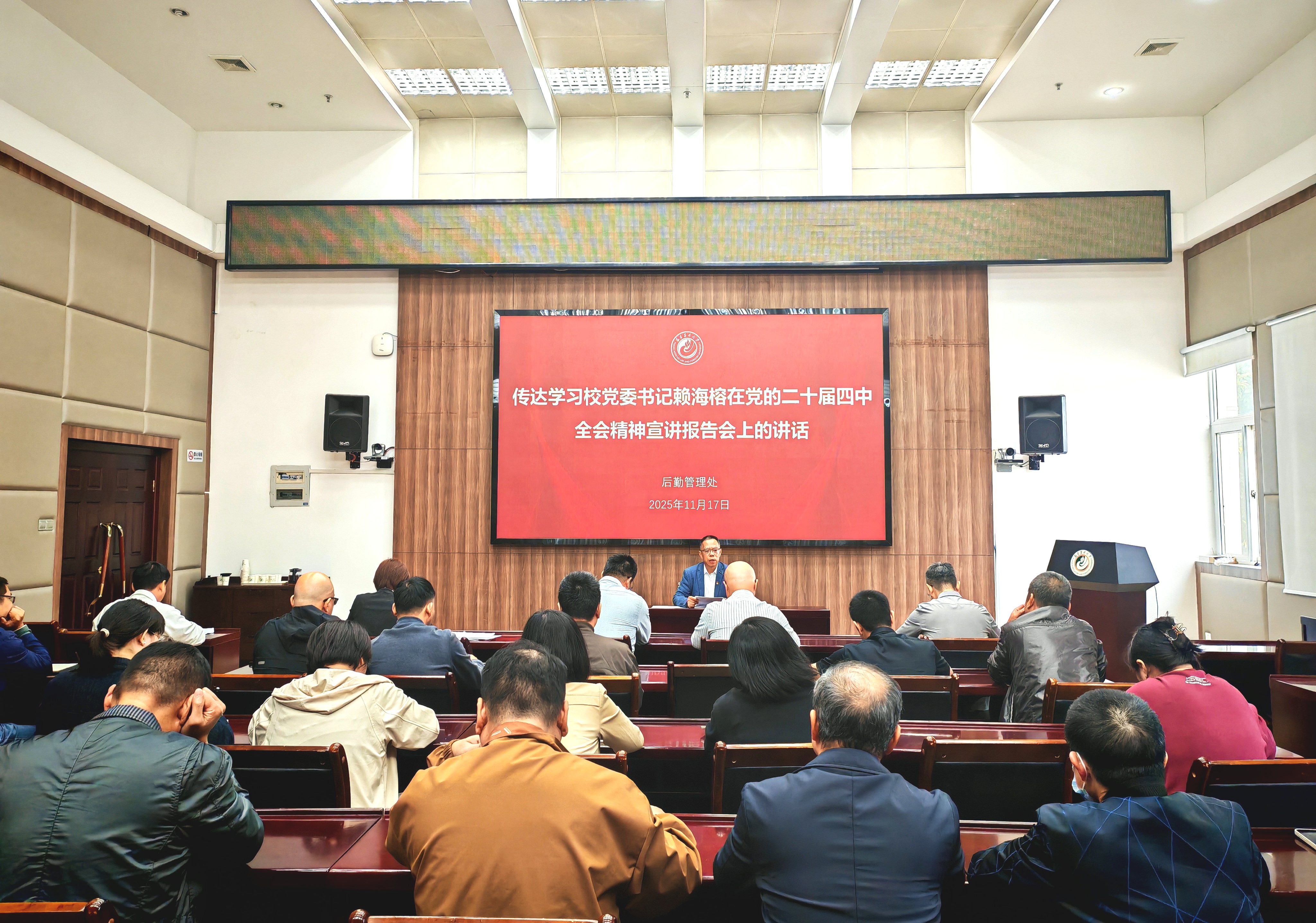 为深入学习贯彻党的二十届四中全会精神,切实把思想和行动统一到全会精神上来,11月17日,后勤管理处在明德楼龙岩厅召开专题学习会,传达学习校党委书记赖海榕在党的二十届四中全会精神宣讲报告会上的讲话精神,研究部署后勤管理处贯彻落实举措。后勤管理处处长曾海滨主持会议,后勤管理处全体党员及在编员工参加会议。