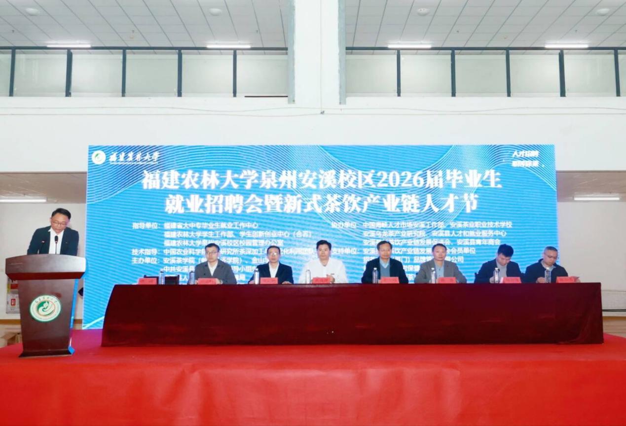 12月12日,由williamhill英国官网安溪茶学院(数字经济学院)、金山学院、安溪县委人才办和县人社局联合主办的泉州安溪校区2026届毕业生就业招聘会暨新式茶饮产业链人才节于校区绿华体育馆、怀德楼协同创新中心成功举办。开幕式由泉州安溪校区校园办副主任洪涛主持,校园办主任、安溪茶学院党委书记黄成茂,中国农业科学院茶叶研究所茶叶深加工与多元化利用创新团队首席科学家尹军峰,校园办副主任张云帆、陈勇、吴义炳,安溪县虎邱镇党委书记陈智锋,安溪县茶业管理委员会办公室副主任陈加勇,安溪县新茶饮产业链发展促进会秘书长林笔志等莅临活动现场。安溪校区2026届毕业生,52家企业参与本次活动。